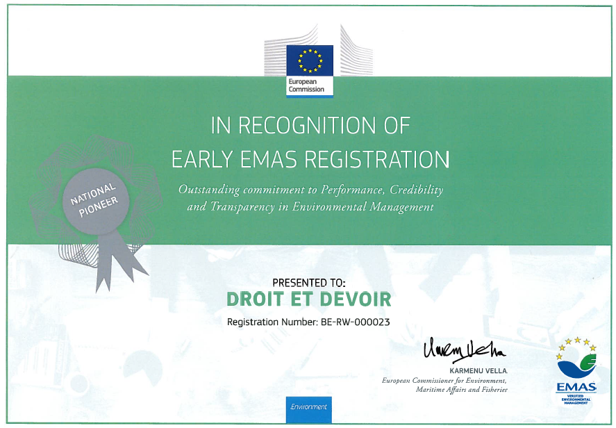 Droit et Devoir asbl est certifiée EMAS, ISO 14001, label entreprise éco-dynamique: les systèmes de certification des SME